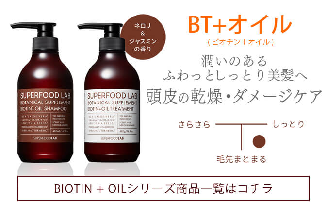 地肌環境を整え、扱いやすい美髪に整えるシャンプー&トリートメント。 地肌と髪に働きかける美容補酵素「ビオチン」と、スーパーフード成分配合。 自然と科学を融合させ、根本からキレイに、潤いを与え、美髪に導きます。 洗練されたボトルがバスルームを癒しの空間へと演出してくれます。