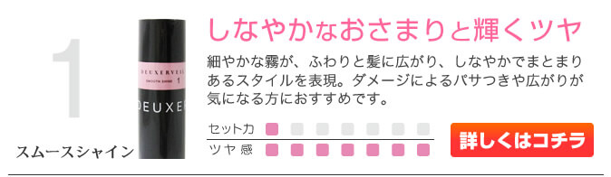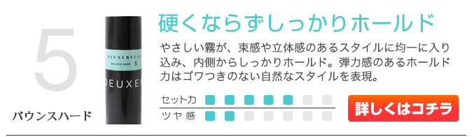 細かな霧でヘアをデザインする、ヘアスプレー。スタイリング×ケアのダブルエフェクトで、スタイリングしながらダメージをケア。毛先までのうるおいやツヤ感を、スタイルとともにキープ。自由に、より美しいヘアデザインへと導きます。
