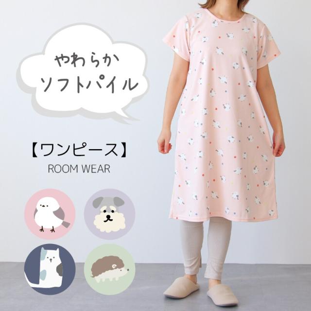 ルームウェア レディース ワンピース 半袖 パイル地 部屋着 パジャマ やわらか ソフトパイル ルームワンピース 膝丈 春 夏 カットソー ク