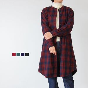 裏フリースチェック ノーカラーワンピース レディース トップス チェックシャツ ネルシャツ シャツワンピース スタンドカラー 裏起毛 暖