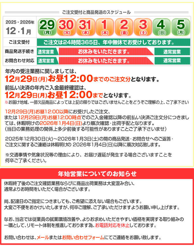 天候不良および自然災害の影響により、一部地域での集荷・配送の停止や遅延が発生しております。 配送の詳しい状況につきましては、下記各配送会社のホームページでご確認ください。 ※外部のサイトとなります。 -------------- ◎https://www.post.japanpost.jp/newsrelease/index.html 日本郵 ◎https://www2.sagawa-exp.co.jp/information/list/ 佐川急便 ◎https://www.kuronekoyamato.co.jp ヤマト運輸 -------------- お届け日時指定を頂戴しておりますご注文につきましては、ご指定通りにお手配をさせていただきますが、上記理由により配送遅延が発生する可能性がございます。 お客様には大変ご迷惑をお掛けいたしますが、何卒ご理解ご了承下さいますようお願い申し上げます。 |
