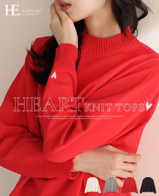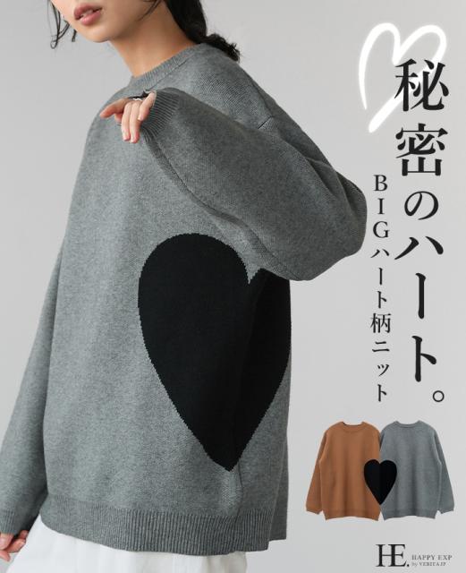 [新作限定P10%×送料無料]BIGハート柄ニット セーター レディース トップス 長袖 クルーネック 丸首 ハート 配色 体型カバー ゆったり