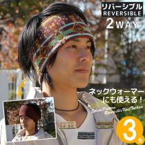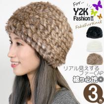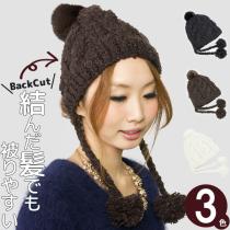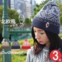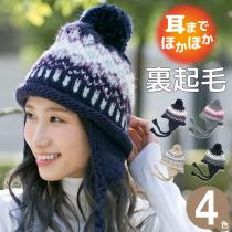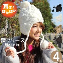 ボアフリース雪柄ボンボン耳あて付ニット帽
