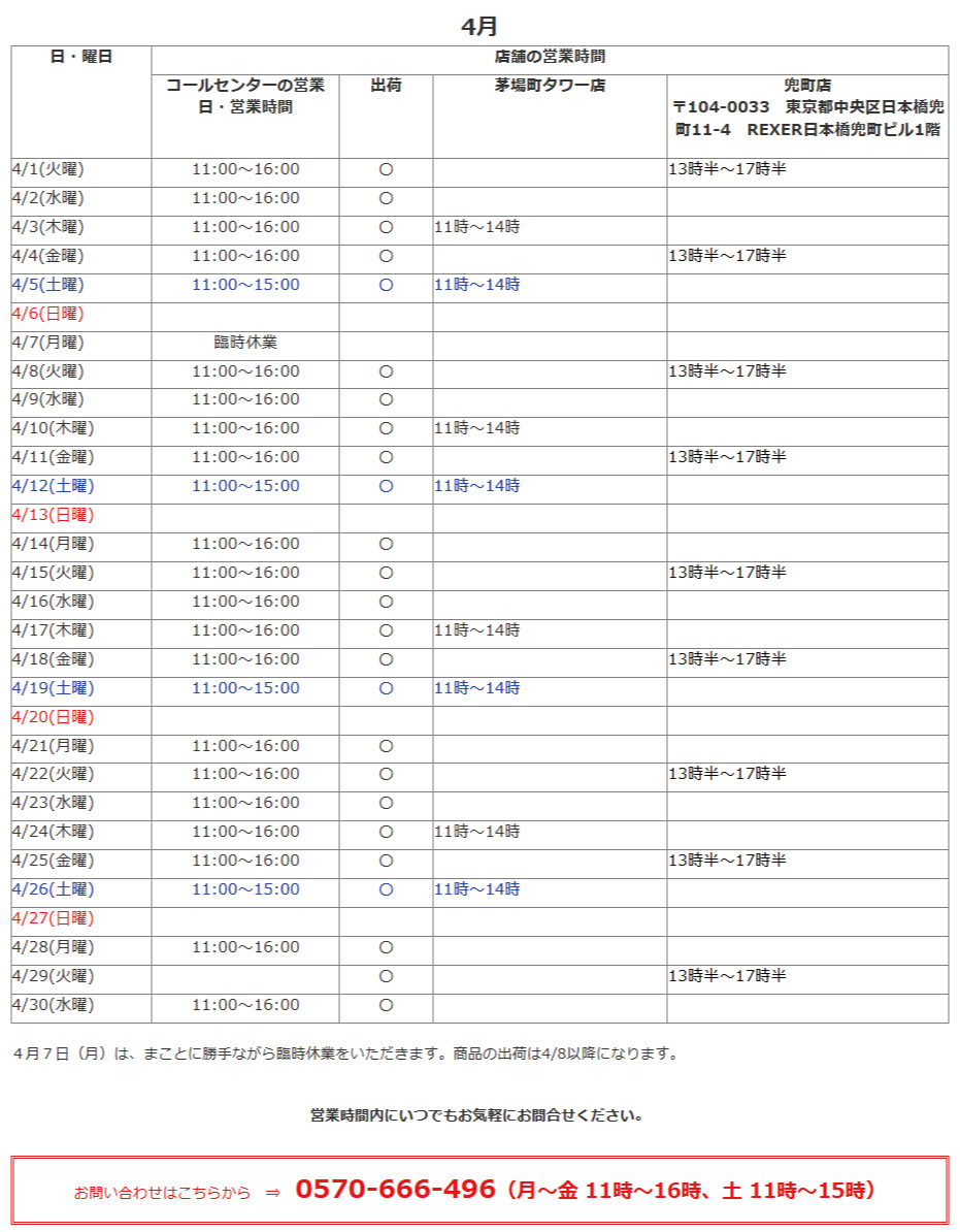 営業時間内にお気軽にお問合せください。 お問い合わせはこちらから 0570-666-496 (月〜金 11時〜16時、土 11時〜15時) ご来店ご希望の方は、お電話にてご予約を承ります。コールセンターまでお気軽にお問い合わせください。 ★店舗の営業時間は以下の通りです。 ![]() |