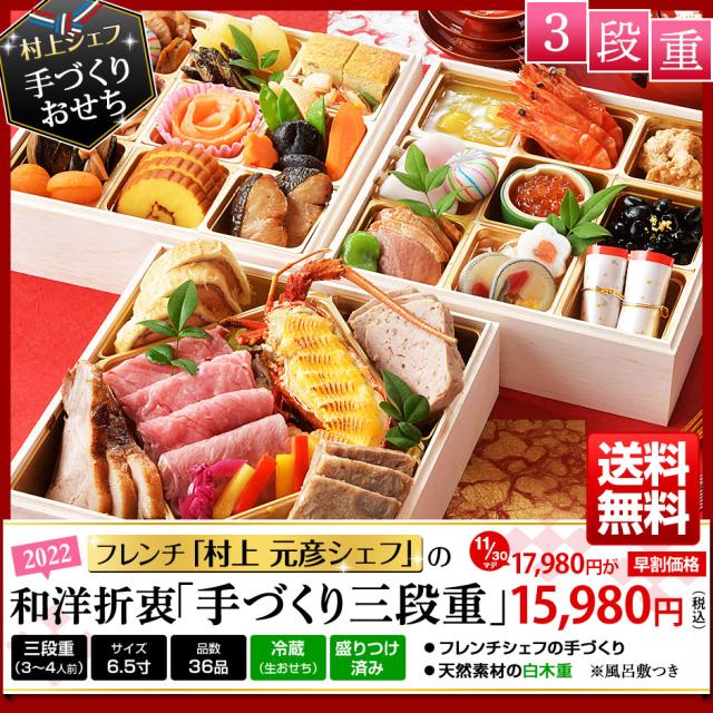 【送料無料】【早割特価11/30まで】御節料理 2022 和洋折衷 おせち 生詰め 白木3段重 村上元彦シェフ お歳暮
