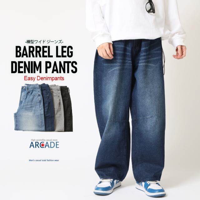デニムパンツ メンズ ジーンズ 秋新作 ワイドデニムパンツ ジーパン バレルレッグジーンズ 加工デニム ウエストゴム ドローコード