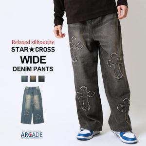 ワイドデニムパンツ クロス スター オーバーダイ Y2K ワイドジーンズ