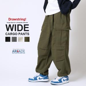 ワイドカーゴパンツ メンズ 秋新作 ワイドパンツ 裾絞り ドローコード 前開き ウエストゴム入り カーゴパンツ