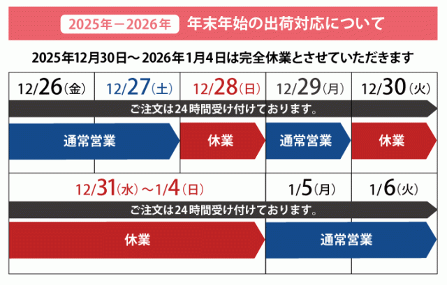 メーカー取り寄せ商品となりますので、【12月26日正午以降】にご注文いただきました商品は【1月7日以降】の出荷とさせていただきます