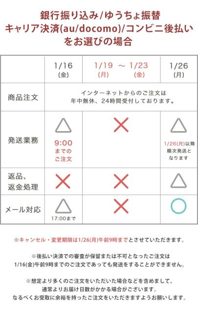 この期間中のご注文分の発送につきましては、ご選択いただいたお支払い方法によって異なります。以下の表をご確認の上ご注文いただきますようお願いいたします。