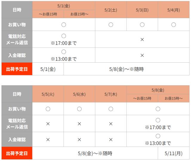 GW期間休業中の配送・お問合せについて