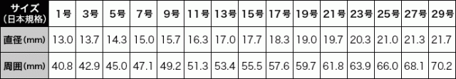 国内のサイズは日本規格で統一されていますので指輪は全て下記の表が基準となっています。