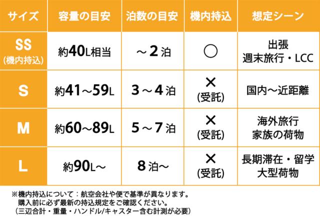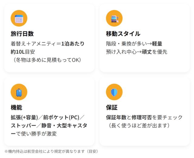 旅行日数と荷物量から、あなたに合うスーツケースサイズがすぐ分かります。