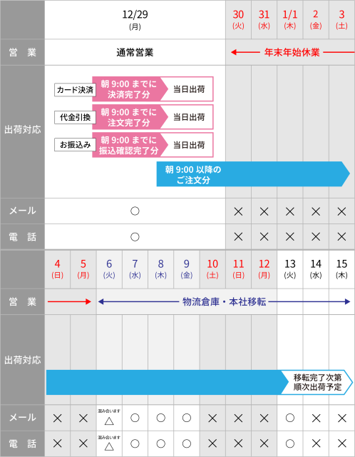 年末年始及び物流倉庫移転に伴う休業のお知らせ