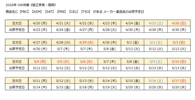 メーカー直送品につきましては、下記、出荷目安の一覧をご覧ください。