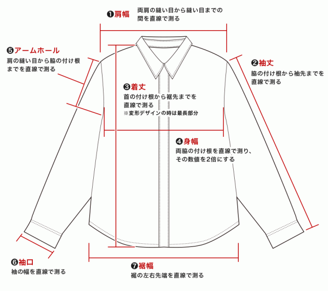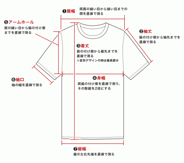 ・ 着丈:首の付け根から裾先までを直線で測る ※変形デザインの時は最長部分