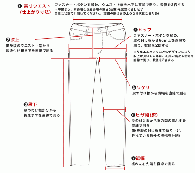 ※サルエルパンツなどのデザインにより股上が長いもの等は、お尻の当たる部分を直線で測り、数値を2倍する