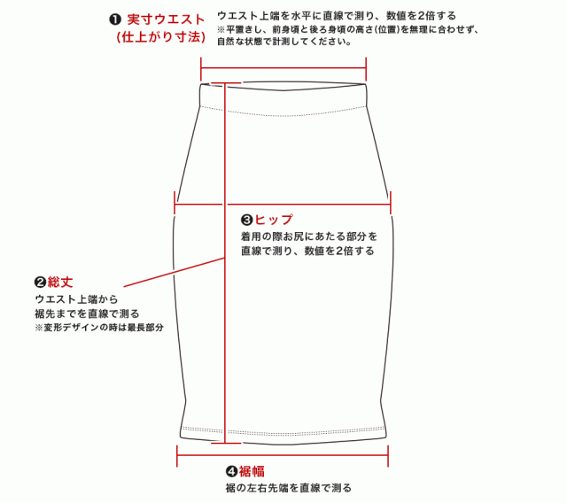 ・ 総丈:ウエスト上端から裾先までを直線で測る ※変形デザインの時は最長部分