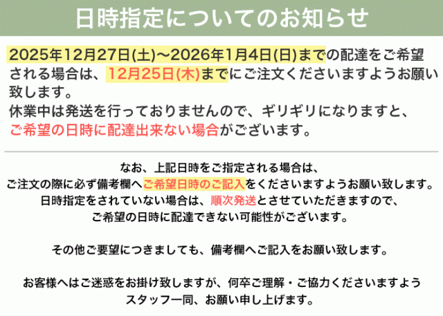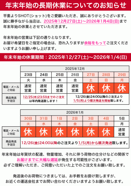 誠に勝手ながら2025年12/27(土)~2026年1/4(土)まで 年末年始に伴い長期休業致します。