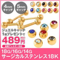 ボディピアス 選べる3サイズ 18G 16G 14G カラーストレートバーベル【18Kゴールド】ジュエルキャッチをお一つプレゼント!(1個売り)◆オマ