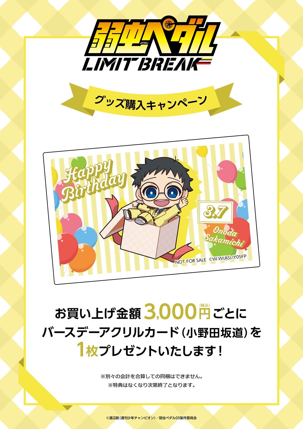 ■【バースデーアクリルカードプレゼントキャンペーン】 期間中にTVアニメ『弱虫ペダル LIMIT BREAK』の「小野田坂道バースデー」デザインの商品をご予約・ご購入いただいたお客さまを対象に「バースデーアクリルカード」をプレゼント! ■配布の注意事項 ※キャンペーン期間:2026年3月7日(土)17:00〜 ※税込み3,000円ご購入毎でバースデーアクリルカード1枚となりますが、1注文の中での金額計算になります。 ※全1種 ※バースデーアクリルカードがなくなり次第キャンペーン終了となります。 ※発送は、ご注文商品・特典が全て揃ってからまとめて発送となります。 ※TVアニメ『弱虫ペダル LIMIT BREAK』の「小野田坂道バースデー」デザイン以外の商品はキャンペーンの対象外となりますのでご注意ください |