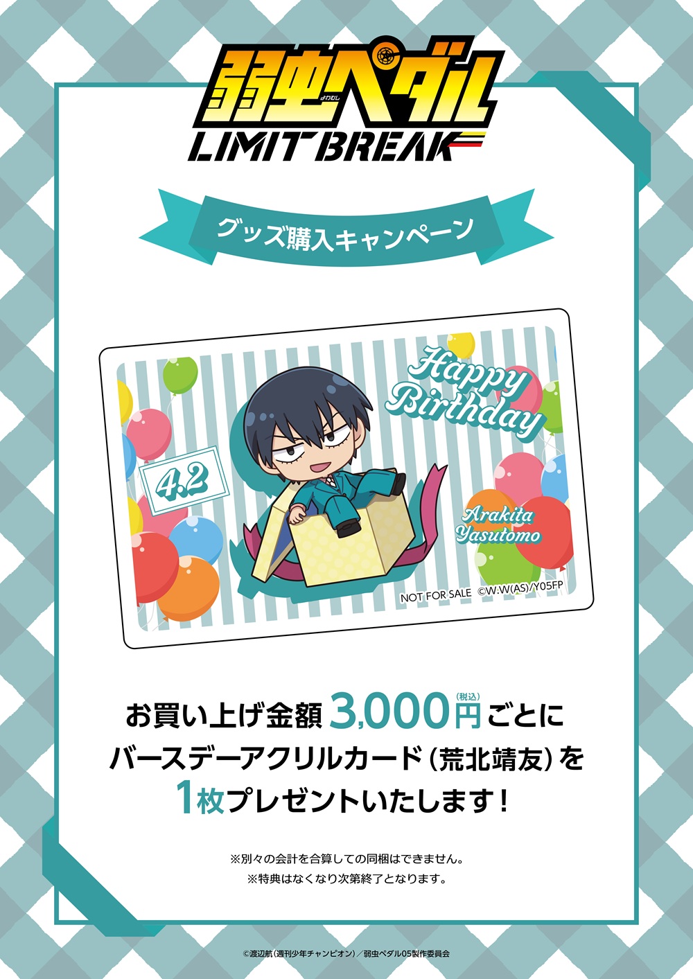 ■【バースデーアクリルカードプレゼントキャンペーン】 期間中にTVアニメ『弱虫ペダル LIMIT BREAK』の「荒北靖友バースデー」デザインの商品をご予約・ご購入いただいたお客さまを対象に「バースデーアクリルカード」をプレゼント! ■配布の注意事項 ※キャンペーン期間:2026年4月2日(木)17:00〜 ※税込み3,000円ご購入毎でバースデーアクリルカード1枚となりますが、1注文の中での金額計算になります。 ※全1種 ※バースデーアクリルカードがなくなり次第キャンペーン終了となります。 ※発送は、ご注文商品・特典が全て揃ってからまとめて発送となります。 ※TVアニメ『弱虫ペダル LIMIT BREAK』の「荒北靖友バースデー」デザイン以外の商品はキャンペーンの対象外となりますのでご注意ください |