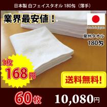 【送料無料】業界最安値! 60枚セット 日本製 泉州 白タオル 薄手 180匁 / タオル 普通のタオル 白いタオル 業務用タオル フェイス 白 ホ
