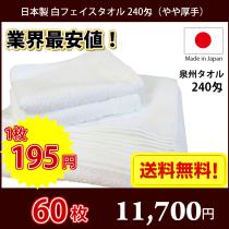 【送料無料】業界最安値! 60枚セット 日本製 泉州 白タオル やや厚手 240匁 / タオル 普通のタオル 白いタオル 業務用タオル フェイス