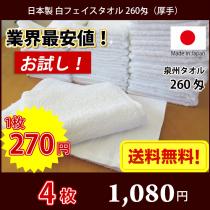 【送料無料】業界最安値!お試し4枚セット 日本製 泉州 白タオル 厚手 260匁 / タオル 普通のタオル 白いタオル 業務用タオル フェイス