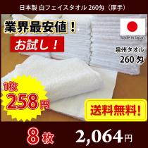 【送料無料】業界最安値! 8枚セット 〜 日本製 泉州 白タオル 厚手 260匁 / タオル 普通のタオル 白いタオル 業務用タオル フェイス 白