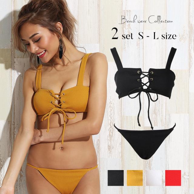 水着 ビキニ レディース スイムウェア テレコ生地フリル付きビスチェビキニ 無地 2カラー ノンワイヤー S/M/L イエロー ピンク 海 プール