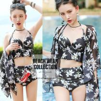 水着 ビキニ レディース 花柄シフォンロングワンピース付きビスチェビキニ 体型カバー 3点セット ブラック ワイヤー入り ママ水着 M/L/XL