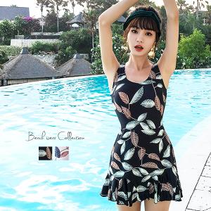 水着 レディース ワンピース 体型カバー リーフ柄 大きいサイズ ママ水着 ミセス おしゃれ セクシー かわいい リゾート 大人 女性用 日焼