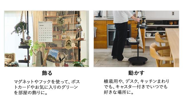 例えばトレイやフックを組み合わせてオブジェや観葉植物を飾ってお部屋に彩りを加える。