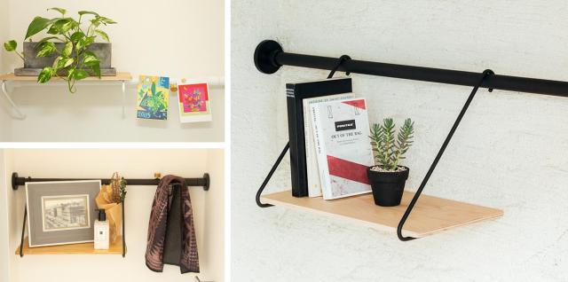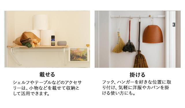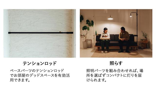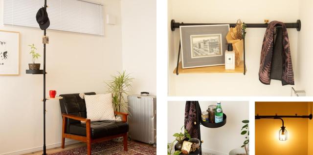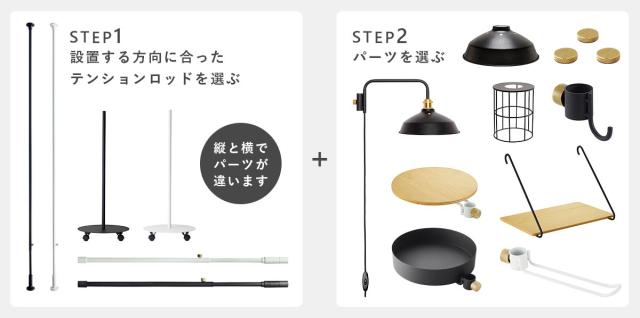ベースとなるテンションロッド(突っ張り棒)にパーツをカスタマイズして、オリジナルのインテリアをつくることができます。