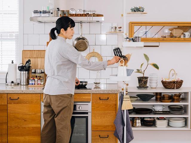 収納が不足しがちなキッチンにはトレーを使っての小物収納が大活躍です。フックも組み合わせてタオルやほうきも掛けることも可能です。