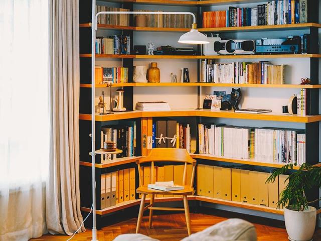 シェードを組み合わせればピンポイントで光を届けられます。テーブルにはコーヒーを置いて快適な読書空間にアレンジ。