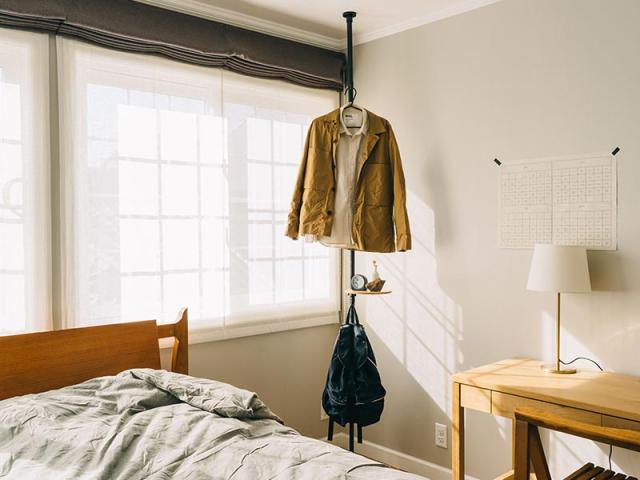 寝室には目覚まし時計やメガネを置くのに便利なテーブルを組み合わせ。そして翌日着る服やバッグを掛けておけるフックハンガーをプラス。