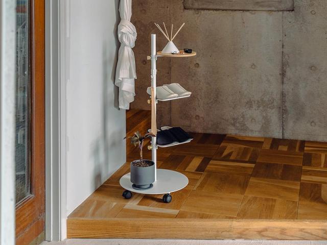 移動可能なMove Rodに鍵やアロマ等を置くテーブルを組み合わせて、シューズラックを合わせると来客用スリッパもすっきり収納出来ます。