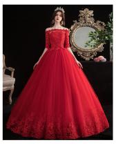 レッド ウェディングドレス カラードレス ロングドレス オフショルダー マタニティ 大きいサイズ 赤 パニエ付 オーダーサイズ可 H078