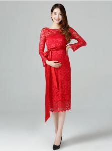 超可愛い マタニティ 妊婦ドレス ミディアムドレス ワンピ パーティドレス ミドル丈 9分袖 赤 白 黒 大きいサイズ 結婚式 二次会 D078