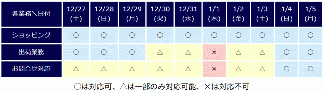 ・12月30日から1月3日までの注文受付は、午前8時までの1回させていただきます。また、1月1日は休業し、出荷・問合せ対応は1月2日より順次行います。