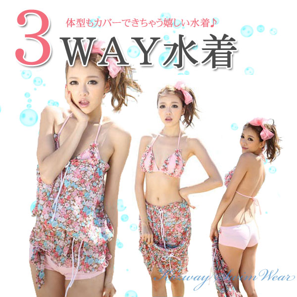 【送料無料メール便可】タンキニ水着 可愛い小花柄の水着!お得な3点セット 激安 リゾート ピンク レディース 白色 短パン ズボン