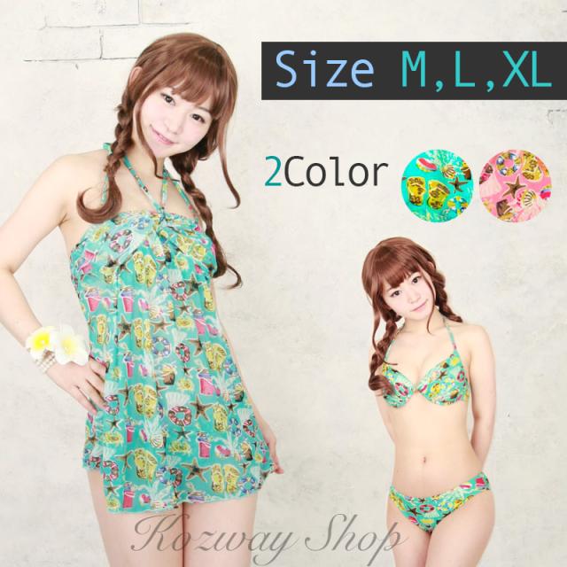 【送料無料】タンキニ 水着 3点セット とってもお洒落で可愛い水着が超格安で登場 マリン柄 選べる2色 M−XLサイズ ピンク
