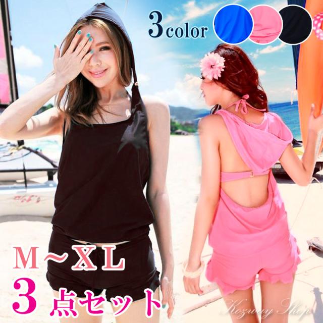 【送料無料】【タンキニ水着】レディース フード付きタンキニ水着 無地 ピンク ブルー ブラック M〜XLサイズ 9号 11号 13号 女性用