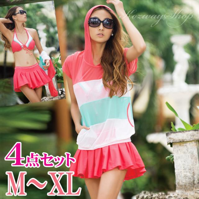 【送料無料】【タンキニ水着】トップスとスカート付きのお得なビキニ4点セット ボーダー柄レディース水着 体型カバー ピンク M〜XL