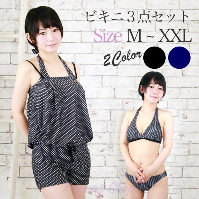 セール価格【送料無料】体型カバー水着 ロンパース ドット柄 ブルー&ブラックカラー タンキニ 3点セット 激安 リゾート