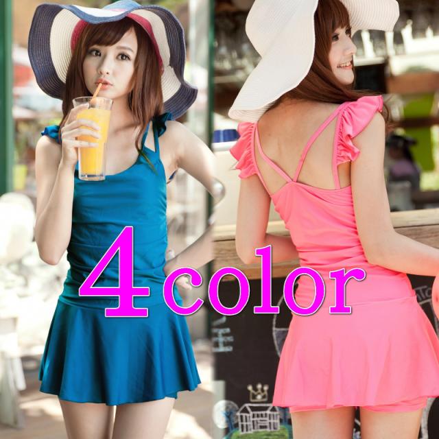 【送料無料】M〜XLサイズ 体系カバー水着 ワンピースタイプ バックスタイルがカワイイ!短パン付き フリル ブルー ピンク お洒落