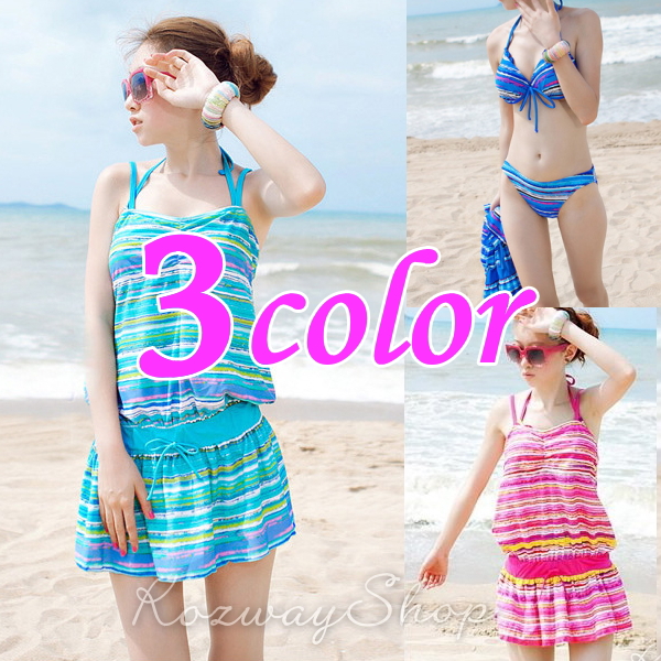 【送料無料】豪華3点セット 体系カバー水着 ボーダー柄 選べる3色 激安 リゾート グリーン ブルー ピンク Mサイズ Lサイズ XL