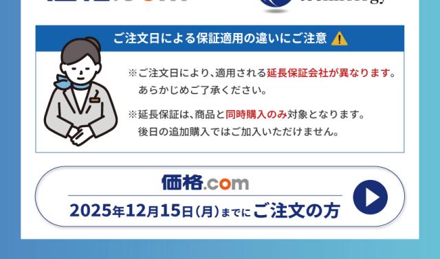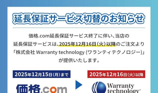 2025年12月16日注文分より延長保証会社を価格.comからWarranty technology社へ変更しました。